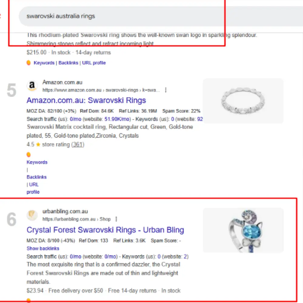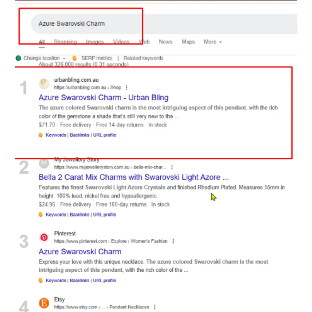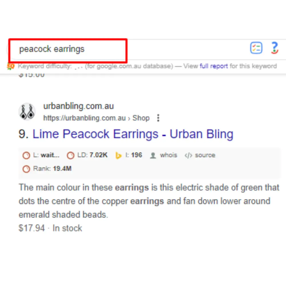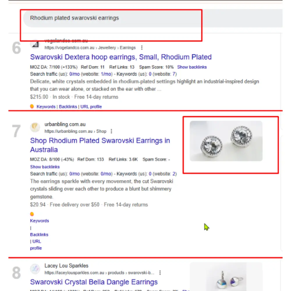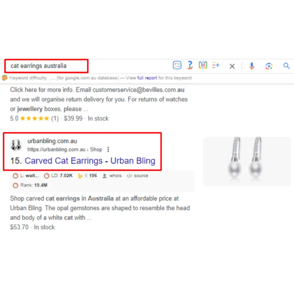 The site gained visibility for a range of new keywords, including “cat earrings australia,” “peacock earrings,” and “azure swarovski charm,” demonstrating the success of the on-page and content strategy.