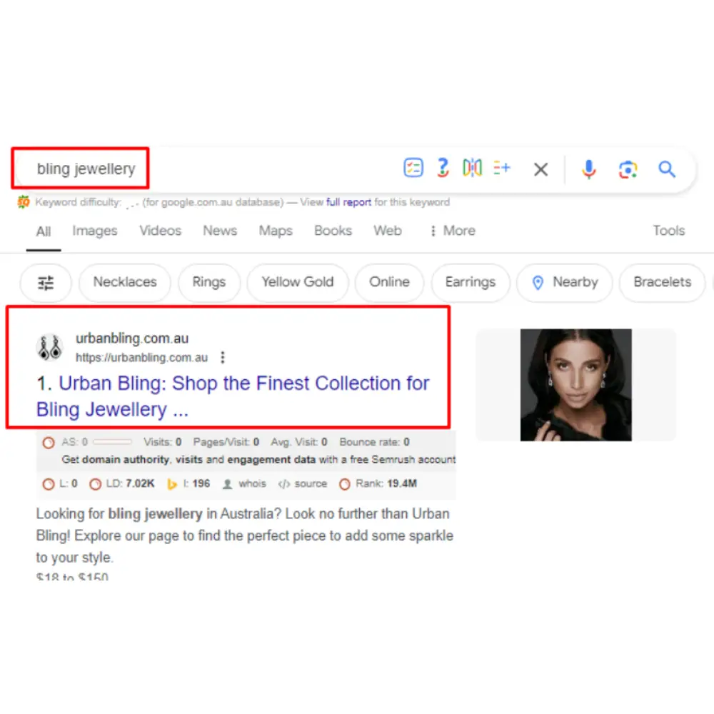 Urban Bling faced the challenge of establishing a strong organic presence in the highly competitive Australian online jewelry market. The initial state of the website showed minimal organic traffic and low search visibility for key product and brand-related queries. The goal was to increase organic clicks, impressions, and user engagement to drive brand awareness and sales.